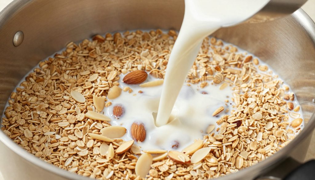 Place the saucepan over medium-low heat. Cook for 3–5 minutes, stirring often, until thick and creamy. Add extra almond milk if you prefer a thinner texture.