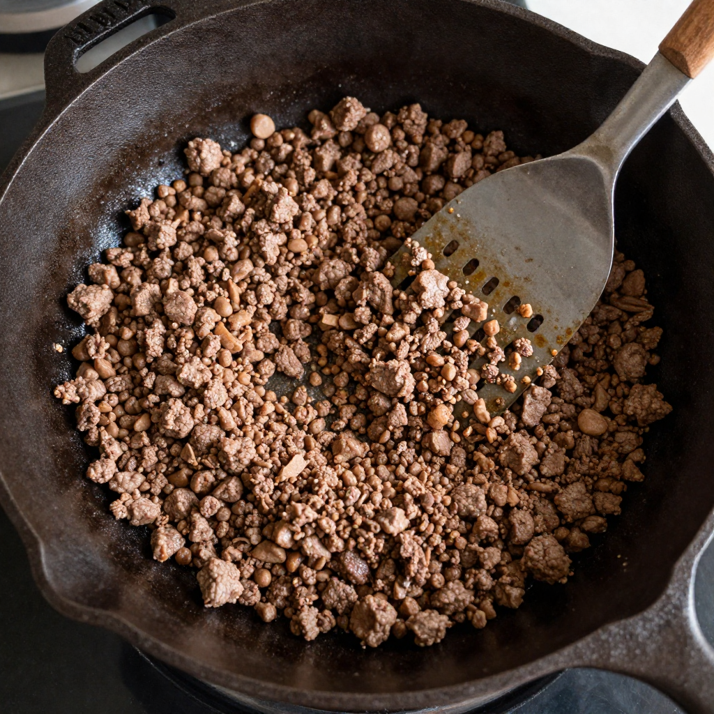 Heat a large skillet over medium heat. Add the ground beef and cook until browned, breaking it apart with a spatula as it cooks.