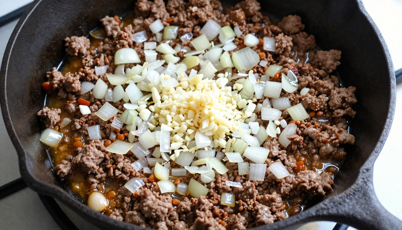 Stir in the diced onion and minced garlic. Cook for 2–3 minutes until the onion softens and becomes fragrant.