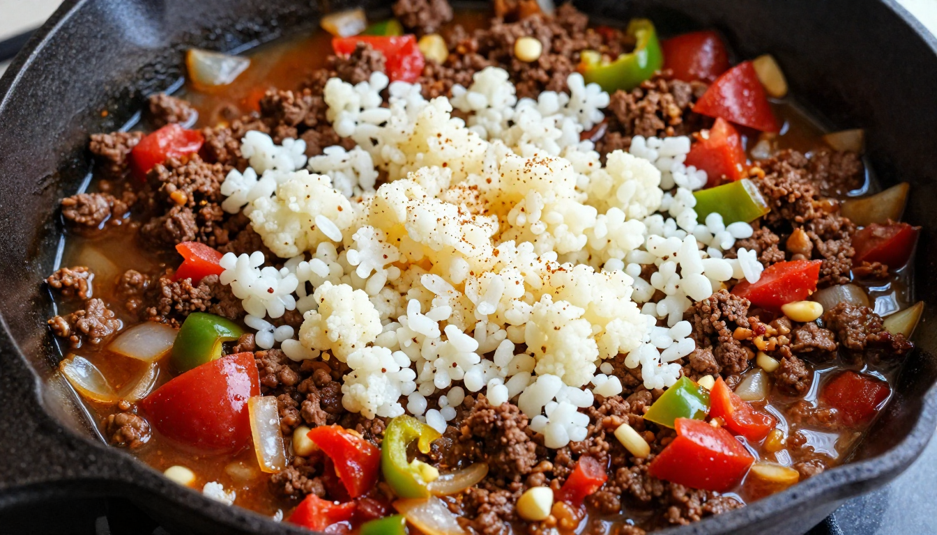 Stir in the cauliflower rice and beef broth. Simmer for 3–4 minutes until the cauliflower softens and the mixture thickens slightly.